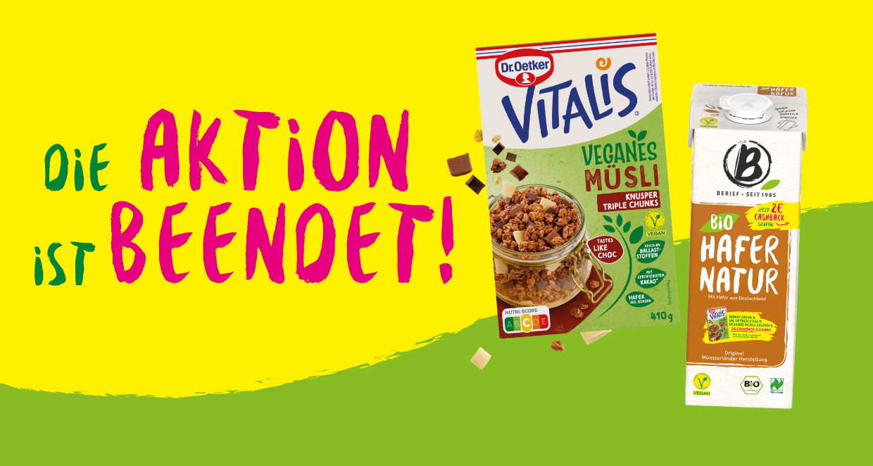 Es nehmen Berief Drinks sowie Dr. Oetker Vitalis Veganes Müsli an der Aktion teil. Bitte beachte, dass nicht alle Artikel immer und überall verfügbar sind.