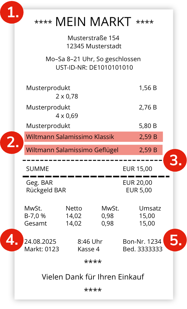 Von dem Kassenbon, der den Kauf der teilnehmenden Produkte belegt, musst Du ein gut lesbares Bild oder einen Scan in den Datei-Formaten JPG, JPEG, PNG oder PDF mit maximal 8 MB hier auf der Aktionswebseite hochladen und das Teilnahmeformular vollständig ausfüllen. Der Original-Kassenbon muss bis zur erfolgreichen Erstattung des Cashbacks aufbewahrt werden.